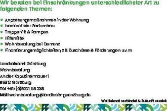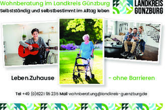 Ob nach einem Unfall, wegen einer angeborenen Behinderung oder aufgrund von Erkrankungen im Alter - wer sich nicht gut bewegen kann, trifft auf viele Alltagshürden. Die Wohnberatung Landkreis Günzburg berät alle Menschen mit Einschränkungen im eigenen zu Hause und entwickelt individuelle Lösungen. Die weitgehende Selbstständigkeit zu Hause soll mit Hilfsmitteln sowie kleineren und größeren Umbaumaßnahmen unterstützt werden.
