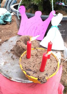 In dieser Woche feiern wir am Grundstück den Geburtstag einer Waldmaus. Wir dekorieren den kleinen Baumstumpf in der Mitte unseres Morgenkreises mit einem bunten Tuch, den Geschenken und drei leuchtenden Kerzen.