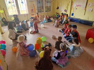 Die kleinen Närrinnen und Narren führten lustige selbstbestimmte Spiele wie Topfschlagen, Pantomime-Spiel, Heiße Kartoffel und den beliebten Stopptanz durch. Dazwischen tanzten und schunkelten sie wild durcheinander. Auch die Polonaise kam nicht zu kurz.