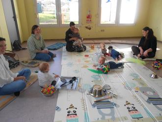 Seit Januar 2026 treffen sich die Babys (4 Monate – 14 Monate) mit ihren Mamas in unserem Krabbelraum. Auf zwei abwaschbaren, riesengroßen Krabbeldecken, die dafür angeschafft wurden, haben die Babys die Möglichkeit, sich gegenseitig zu befühlen, zu spielen, sich kennenzulernen.