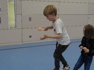 Im Anschluss starteten sie mit einem Aufwärmprogramm, bei dem gewürfelt und gelesen wurde und sich alle ausreichend „warm machten“. Danach gab es sechs unterschiedliche Stationen, bei denen die Kinder erproben konnten, ob sie auch so „fit sind, wie der Osterhase“. So wurden unter anderem Eier über Bänke balanciert oder über einen Fluss transportiert. Nach jeder Station durften die Kinder auf ihrem Laufzettel ihre erledigte Station abstempeln. Das machte allen sehr viel Freude und die Kinder waren mit Begeisterung dabei.