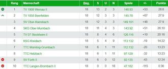 Ein kurioses Saisonende nahm die Bezirksklasse Odenwald - nachdem unsere Zweite an Spieltag 6 die Tabellenführung übernommen hatte, musste man am letzten Spieltag nach der Niederlage beim Tabellenvierten in Ober-Mumbach um die Meisterschaft bangen. Doch der Zweitplatzierte vom TV Beerfelden konnte die Vorlage nicht nutzen und verlor zuhause gegen den Tabellendritten aus Ober-Kainsbach denkbar knapp. Somit konnte unsere Zweite eine unerwartete Meisterschaft feiern. Basis hierfür war, dass alle eingesetzten Stammspieler über die Gesamtsaison mehr Einzel gewannen als verloren - hervorzuheben dabei Dirk Keßler mit 23:10 Siegen im vorderen Paarkreuz, Rainer Vollrath und Alexander Fornoff mit je 19:7 Siegen in der Mitte, und Patrick Keil mit 15:7 Siegen im unteren Paarkreuz. Auffallend dagegen die Schwäche in den Doppeln - hier konnten nur 27 der ausgetragenen 60 Doppel siegreich gestaltet werden. Damit spielt unsere Zweite in der kommenden ebenfalls in der Bezirksliga.