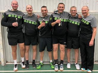 Unser Meister-Team mit (von links nach rechts) Patrick Keil, Alexander Fornoff, Philipp Bernhard, Dirk Keßler, Henning Beck und Heiko Schulz. Auf dem Bild fehlen Joachim Heldmann und Rainer Vollrath, sowie Miriam von Nordheim-Diehl, die als Ersatzspielerin mit einer Einzelbilanz von 8:1 oft die entscheidenden Siege einfuhr.