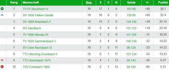 Mit drei Punkten aus den letzten Spielen hat unsere Erste die Saison beendet und mit 21:19 Punkten wurde letztendlich Platz 4 erreicht. Möglich wurde diese Platzierung durch die sehr guten Leistungen von Torsten Schulz (27:7 Siege) und Simon Riegsinger (11:3 Siege) im vorderen Paarkreuz - hinzu hatte man mit Torsten Schulz/Frank Heisel (13:2 Siege) das drittbeste Doppel in der Bezirksliga. Leider musste man zu oft mit Ersatzstellungen antreten, so dass eine bessere Punktzahl und Platz 2 durchaus möglich gewesen wäre.