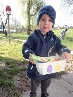 Endlich konnten wir uns anziehen, um nach Osterkörbchen in unserem Garten zu suchen. Voller Freude und Spannung stürmten wir hinaus und unsere Augen leuchteten umso mehr, als wir ziemlich alle ein Körbchen in unseren Händen hielten.