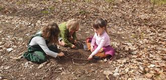 Am ersten Tag nach den Osterferien freuten wir uns über das sonnige Wetter. Im Morgenkreis besprachen wir, wie sich der Wald in den Tagen unserer Ferien veränderte. Die Bäume bekommen Blätter. Die jungen Blätter der Buche dürfen wir sogar kosten – erfrischend säuerlich schmecken diese. Die Veilchen und das Immergrün am Wegesrand blühen. Der Wald sieht wieder grün und satt aus. Die kleinen Spinnen werden wieder lebendig, Marienkäfer sind aufgewacht und Schmetterlinge in verschiedenen Farben begleiten unseren Spaziergang. Wir finden sogar noch Schokoeier auf dem Weg zu unserem Waldspielplatz. Diese zählen wir und rechnen damit, bevor wir sie mit dem Spiel „Pinke, Ponk, der Schmied ist krank, wo soll er wohnen, unten oder oben ...“ verteilen.