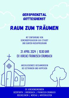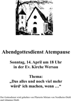 Nach den Ostertagen warten wieder zwei besondere Gottesdienste auf viele Besucherinnen und Besucher. Am Sonntag, dem 14. April, werden wir wieder einen meditativen Abendgottesdienst feiern, mit Gitarrenmusik und der Möglichkeit, in Form von Steinen und Kerzen seine eigenen Gedanken vor Gott zu bringen. Am Sonntag, dem 21. April, wollen wir in Fränkisch-Crumbach einen gemeinsamen Gottesdienst in der Nachbarschaft feiern. Alle Gemeinden im Gersprenztal sind an dem Gottesdienst beteiligt: Beerfurth, Brensbach, Fränkisch-Crumbach, Reichelsheim, Wersau und Winterkasten. Diese Gemeinden werden in naher Zukunft auch eine große gemeinsame Kirchengemeinde oder Arbeitsgemeinschaft bilden. Dieser Gottesdienst soll eine Art „Startschuss“ für die Zusammenarbeit sein. Dazu wird auch unsere neue Gemeindepädagogin Ilka Staudt endlich offiziell eingeführt und wir dürfen uns auf eine schöne Zusammenarbeit freuen. Viel Musik wird diesen Gottesdienst umrahmen, und im Anschluss laden wir auch herzlich zu kleinen Snacks und zum Bleiben ein.