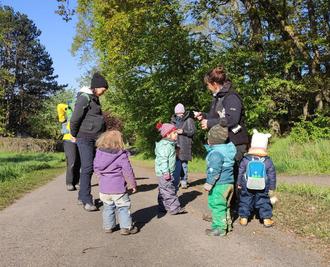 Auf dem Weg kitzelt uns die warme Sonne im Gesicht. Seifenblasen fliegen durch die Luft, Pusteblumen stehen am Feldrand und da sie noch ganz nass sind, können sie nicht fliegen, wenn wir sie wegpusten.