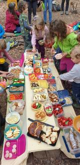 Nach dem Theater fanden die Waldmäuse in ihrem, in den Tagen zuvor gebauten Nest, bunte und leckere Überraschungen für jedes Kind. Die Waldfüchse suchten ihre gebastelten Nester im Wald und fanden diese abschließend. Mit vollem Bauch und einem Lächeln im Gesicht verabschiedeten sich die Kinder und Erwachsenen voneinander.