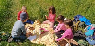 Gemeinsam liefen wir zur großen Wiese hinter dem Grundstück. Mit Körben in der Hand suchten die Schulfüchse die Kräuter, von denen sie bereits im Morgenkreis gekostet hatten.
