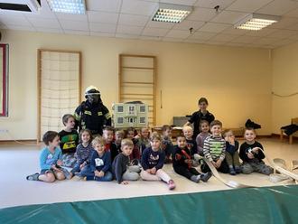 Anschließend sprachen wir über die Kleidung des Feuerwehrmannes/ der Feuerwehrfrau und anhand einer Demonstration von Olli konnten alle Kinder sehen, wie ein Atemschutzgeräteträger in Vollmontur aussieht.