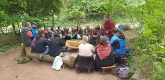 Am vergangenen Freitag trafen sich die Familien des Waldkindergartens zum „Aktiven Elternabend“. Zu Gast kam Elsbeth Leitner, frisch ausgebildete Kräuterexpertin, in die Runde. Zur Begrüßung lagen bereits einige Kräuter von der Wiese, die ans Grundstück des Waldkindergartens angrenzt, in der Mitte. Elsbeth erzählte über jedes Kraut, welche Wirkung, Eigenschaft, Heilkraft und Geschmack dieses hat. Sehr interessiert und neugierig machten sich die Eltern nach der Begrüßung auf den Weg zum Kräutersammeln. Nach einer Zeit trafen sich alle auf den mitgebrachten Decken zum Schnippeln und Sahne schütteln. Nachdem die Sahne schließlich zu Butter geschüttelt war, vermengten die Eltern die Butter mit den Kräutern, schmierten sie aufs frische Brot und ließen es sich köstlich schmecken. Dabei entstanden Gespräche, Unterhaltungen und die Eltern lernten sich dabei näher kennen. Nachdem die Butter verstrichen und das Brot gegessen war, verabschiedeten sich die Familien.