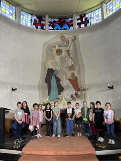 Am darauffolgenden Dienstag ging es zur katholischen Kirche „Mater Dolorosa“, wo die erste Klasse von Küsterin Doris Sauer empfangen wurde. Die Schülerinnen und Schüler erfreuten sich bereits am Weihwasser im Eingangsbereich. In der Kirche entdeckten sie, wie eine Woche zuvor, eine Osterkerze und den Altar. Aber dazu gab es dort noch Weihrauch, Rosenkränze und eine Marienstatue. Die Küsterin hatte sogar die goldene Monstranz für die Kinder auf den Altar gestellt, die alle bestaunten. Als eine Opferkerze angezündet wurde, wollten die Mädchen und Jungen sofort für Familienangehörige beten. Im Anschluss wurde wieder gesungen und natürlich das geliebte Lied der Heiligen Elisabeth von Thüringen zum Besten gegeben. Zum Abschluss wurde die Kirchenorgel begutachtet und das „Vater unser“ gebetet, zu dem Frau Sauer die beiden Glocken läuten ließ. Auch dies begeisterte die Kinder sehr. Draußen konnten dann auf der Pfarrwiese bei Sonnenschein und blauem Himmel wieder die Brotdosen geleert werden.