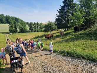 Alle Kinder trafen sich mit ihrem schwer gefüllten Rucksack zur Begrüßung im Container – Raum. Von dort aus liefen wir den Pfeilen nach zur Kirschbach, hoch zum Wasserwerk. Dazwischen war die 1. Picknickpause und es wurde ein unvergesslicher Geburtstag gefeiert, mit lautem Gesang und einer Glitzerrakete. Für alle gab es eine Runde Muffins – mh lecker. Die 2. Picknickrunde verbrachten wir im Schatten am Wasserwerk, denn es war mega heiß geworden. Am steilen Schotterweg bekamen wir Besuch von 3 zottelig, wild aussehenden Bullen, die uns am Zaun beschnupperten – wir fühlten uns wie in Afrika, denn Elefantenbrüllen hörten wir auch auf unserer Wanderreise… Als wir den Abhang vom „Werscher Berg“ bestritten hatten, glaubten wir wahrhaftig, wir seien in der Wüste… heiß, noch heißer, Durst, staubig, Trinkpause im Schatten. Vielen Kindern hing die Zunge bis zum Bauch, doch alle waren stark und zeigten Durchhaltevermögen – schließlich hatten alle Kinder trainierte Muskeln in den Beinen. Im Kindergarten angekommen fanden alle die Schatztruhe im Garten Richtung Trampolin und was war drinnen?