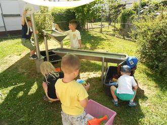 An diesen heißen Tagen ist die Wasserstelle in unserem tollen Garten jeden Tag geöffnet und von den Kindern sehr gut besucht. Mit einer Pumpe spritzen die Kinder selbstständig Wasser (wenn es angestellt ist) in zwei Kippbecken, in denen sie das Wasser mit einem Stöpsel sammeln oder in eine Wanne ablassen können. Mit Bechern, Kannen, Trichtern, Schwämmen und Booten können die Kinder messen, gießen, spielen und experimentieren, was schwimmt oder untergeht.