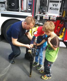 Schon das Betreten des Geländes war sehr spannend, von der Autofahrt dorthin ganz zu schweigen. Als erstes fiel der Fußballplatz ins Auge, der gern von den Schulfüchsen genutzt wurde. Vor dem Rundgang frühstückten wir erst einmal in der Sonne und Wolfgang erzählte uns über seinen Beruf als Feuerwehrmann. In voller Montur präsentierte er uns anschließend das Feuerwehrauto, welches Wolfgang vorfuhr zu inspizieren. Er zeigte uns seinen Platz im Auto und erzählte wie der Einsatz abläuft. Danach zeigte er uns den Wasserschlauch, weitere Details, die zum Einsatz kommen und die Zange und den Spreizer. Den Spreizer durften die Kinder bedienen und stellten fest, dass dieser sehr schwer ist.