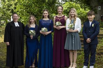 V.l.n.r.: Pfarrerin Miriam von Nordheim-Diehl, Janina Kollbacher, Hannah Dreher, Jasmin Gillich, Lena Amann-Kätscher und Philipp Bristoyannis. Zu den Konfirmanden gehört noch Johanna Schneider.