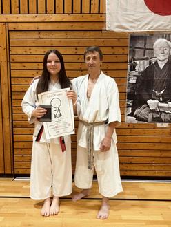 Das fast einjährige intensive Training bei Sensei Stolfa zahlte sich aus und Meda Viciu schaffte unter den kritischen Augen des Bundestrainers Karamitsos und Sensei Giovanni Stolfa ihren Junior-DAN.