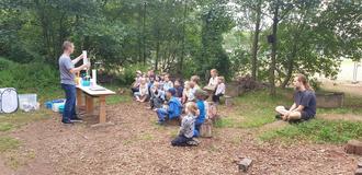 Am Vormittag des Abschiedfestes der Schulfüchse überraschten uns deren Eltern mit dem „Verrückten Kinderlabor“ von Thorsten Schmidt aus Höchst. Er besuchte uns auf dem Grundstück und hatte viele Experimente im Koffer. Es sprudelte, dampfte, knallte und funkte. Die Waldfüchse waren begeistert und sehr aufmerksam. Auch durften sie die Assistenzarbeit zu den Experimenten übernehmen und waren sichtlich stolz.