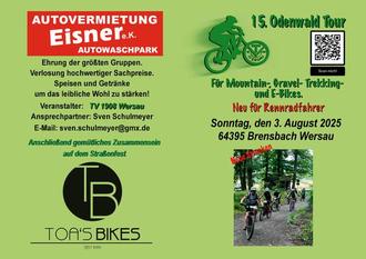 Am Sonntag wird das Treiben ab 10.00 Uhr fortgesetzt. Von 10.00 – 11.00 Uhr starten die Mountainbiker bei der 15. Odenwald Tour an der Sporthalle. Erstmals wurden in diesem Jahr auch 3 Strecken für Straßenradfahrer organisiert. Alle Radfahrer werden zwischen 13.00 u. 14.00 Uhr im Ziel am Straßenfest erwartet.