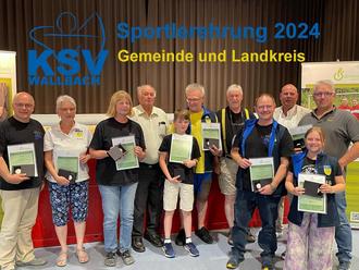 Stellvertretend für alle geehrten, von links nach rechts: Vorne: Uwe Vogel, Kornelia Eidenmüller, Conny Reuter, Erik Schacher, Willi Haßlbauer, Emma Heller Hinten: Sportkreisvorsitzender Wolfgang Fröhlich, Uwe Worschech, Arno Kaczmarek, Erster Kreisbeigeordneter Oliver Grobeis Bericht im Innenteil