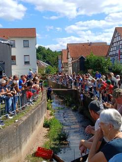 Am Sonntag strömten Jung und Alt, groß und klein zum Frühschoppen auf die Festwiese. „Rolf vun Mosse“ sorgte für den musikalischen Rahmen, bevor die Kerbredd und das traditionelle Kuchenangebot weitere Gäste anlockten – darunter auch viele von außerhalb. Höhepunkt des Tages war zweifellos das Entenrennen auf der Kainsbach: Mit lautstarkem Anfeuern fieberte die ganze Kerbgesellschaft mit, bis schließlich die Ente mit der Nummer 8 den Sieg davontrug.