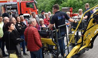 Bei der 60sten E-Card-Verleihung des Odenwaldkreises auf dem Gelände der Freiwilligen Feuerwehr in Erbach konnten die Ehrenamtlichen einen Blick auf die Fahrzeuge der Wehr werfen. Unter anderem ging es im Korb der Drehleiter hoch hinaus.