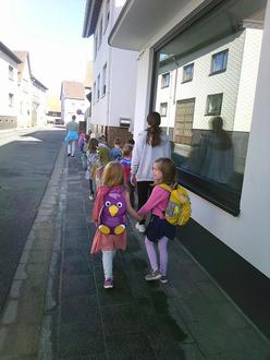 In der Grundschule angekommen trafen die Schulkinder auf ihre zukünftige Klassenlehrerin. Ein erstes Kennenlernen fand statt. Nun konnten die Schulanfänger alle Spielgeräte im Schulhof ausprobieren. Auf dem Weg zurück haben wir weiter die Straßenverkehrsregeln üben können: wie man richtig über die Straße geht und dass man an Einfahrten aufpassen muss.