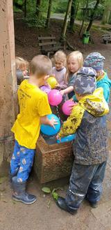 Nach zwei Wochen Eingewöhnungszeit verabschieden die jüngsten Waldfüchse bereits ihre Mamas im Laufe des Vormittags. Nach dem Abschied von der Mama verbringen sie eine Weile alleine in der Gruppe. Auch laufen sie schon lange Strecken. Bis zum Brünnchen führt uns der Weg um dort am Wasser zu spielen. Es macht Freude mit dem Wasser zu spritzen, Barfuß durch den Bach zu waten, bis zu den Schenkeln im Tretbecken stehen und Luftballons mit Wasser zu füllen. Die Kinder stellen fest, dass der Luftballon auf dem Wasser schwimmt und der Wasserballon im Wasser untertaucht. Auch merken sie, dass der Luftballon ganz leicht ist und der Wasserballon schwer. Der mit Wasser gefüllte Ballon, geht leichter kaputt, wenn er aus den Händen gleitet.