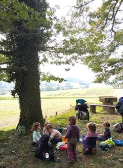Am Morgen treffen wir uns gemeinsam an der Schranke, um uns später auf den Weg zum Fuchsplatz zu machen. Die Spätsommer-Sonne wärmt uns auf unserem Weg. Während wir die Straße hinauf wandern, entdecken wir viele Schnecken, welche sich am Waldrand einen schattigen Platz suchen. An der Apfelwiese vorbeigekommen, sammeln wir zwei heruntergefallene Äpfel ein, welche wir später im Abschlusskreis miteinander teilen. Dabei singen wir gemeinsam das Lied „In einem kleinen Apfel, da sieht es niedlich aus“ und freuen uns, dass die warmen Sonnenstrahlen uns an diesem Vormittag begleitet haben.
