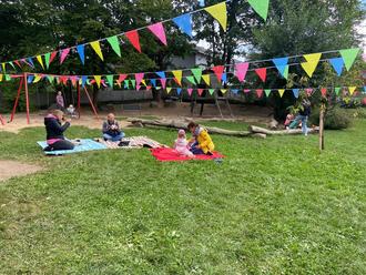 Unter dem Motto „Alle Kinder dieser Welt“ veranstaltete der Kindergarten „De Laabfrosch“ am 14.09.2024 ein Sommer-Picknick. Der Kindergarten öffnete also an einem Samstag seine Pforten und lud dazu alle Kinder und deren Eltern zu einem gemütlichen Beisammensein ein. Der Sommer hatte zwar in der Woche davor eine Pause eingelegt, pünktlich zum Sommer-Picknick aber zeigte er sich wieder von seiner sonnigen Seite. Und so konnten die Kinder ihren Eltern die vielen Spielgeräte im Außenbereich des Kindergartens zeigen. Daneben wurden verschiedene Aktivitäten angeboten, wie etwa eine spannende Edelsteinsuche im Sandkasten. Für große Begeisterung und strahlende Kinderaugen sorgte die aufgestellte Hüpfburg.