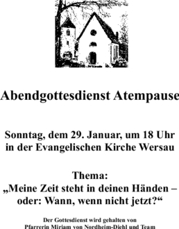 Am Sonntag, dem 29.1., wollen wir wieder einen Abendgottesdienst miteinander feiern. Es wird viel gesungen und schöner Musik (Gitarre und Gesang - live!) gelauscht, wir beten für den Frieden (für die Welt und für uns persönlich) und machen uns meditativ Gedanken zu der Frage: „Wann, wenn nicht jetzt?“ Es soll eine schöne Stunde am Ausklang des Wochenendes sein, die Möglichkeit, zur Ruhe zu kommen und Kraft zu tanken. Kommen Sie doch vorbei - wir freuen uns auf Sie!