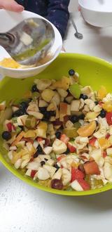 Am vergangenen Freitag trafen sich die Schulfüchse des Waldkindergartens und die Schulis der Kita de Laabfrosch wieder zum gemeinsamen „Schulerlebnis“ in der Lindenhofschule. Im Vorfeld gab es für alle Vorschulkinder eine Einladung mit der Bitte, das Lieblingsobst mit in die Schule zu bringen. Nach der Hofpause trafen wir uns, zum gemeinsamen Frühstück, in der Aula. Im Begrüßungskreis erzählte jedes Kind, welches Obst es als Zugabe für den Obstsalat mitbrachte. Voller Vorfreude, nach dem Händewaschen, verarbeiteten die Schulfüchse und die Schulis in der Mensa ihr mitgebrachtes Obst zu einem Obstsalat. Ananas, Äpfel, Mandarinen, Orangen, Kiwis, Trauben, Bananen, alles wurde geschält, geschnippelt und in einer großen Schüssel gesammelt. Die mitgebrachten Zitronen wurden ausgepresst, um den Saft über den Salat zu geben. ENDLICH durften alle die Leckerei probieren….so gut…und sooooo gesund….mmmmhhhhh. Gestärkt und voller Selbstwirksamkeit verabschiedeten wir uns bis zum nächsten Mal in der Lindenhofschule.