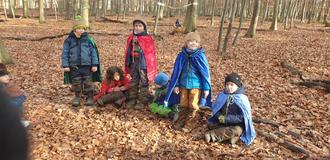 Zum Jahresbeginn spielen die Kinder das Krippenspiel weiter. Die Heiligen Drei Könige, gekleidet in rote, grüne und blaue Gewänder, mit goldenen Kronen auf dem Kopf, machen sich auf den Weg, um die Geschenke an das neugeborene Kind zu übergeben. Ein beschwerlicher Weg für Kasper, Melchior und Baltasar mit ihren Pagis. Schließlich kommen sie jedoch an, im Stall werden sie bereits erwartet. Freudig übergeben sie ihre Geschenke an die junge Familie. Auch dieses Singspiel wird musikalisch begleitet. Immer wieder schlüpfen die Waldfüchse in eine andere Rolle. Selbstbewusst und stolz sprechen sie die Texte und singen die Lieder.