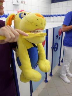 Am vergangenen Dienstag, den 26.09.2023 besuchte uns Zahnarzthandpuppe Olli zusammen mit unserer Patenschaftszahnärztin Frau Dr. Jäger und ihrer Unterstützung in der Kita. Mit allen vier Kitagruppen übten Olli und Frau Dr. Jäger das richtige Zähneputzen mit unseren Kindern im Waschraum. Hierbei wurde die KAI-Methode angewendet, also erst die Kauflächen, dann die Außenflächen und zum Schluss die Innenflächen zu putzen. Olli putzte auch mit allen Kindergruppen fleißig die Zähne mit, sodass die Kinder immer ein praktisches Beispiel hatten.
