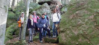 Die Wanderung begann am Naturparkplatz vor Bullau. Ab hier folgten wir dem Rundwanderweg Bu1. Wir waren größtenteils auf naturbelassenen Wanderwegen unterwegs und viele Fliegenpilze säumten unseren Weg. Nach 2,5 km kamen wir zum Ebersberger Felsenmeer und bewältigten hier unseren ersten Anstieg für heute. Durch viel Glück entdeckten wir auch den angekündigten Rutschstein. Wind und Regen haben diesem Buntsandsteinblock im Laufe der Jahrtausende weiche, bemooste Konturen gegeben. Nach Verlassen des Waldes war Bullau schon im Blick und wir ließen uns bei guter Hausmannskost das Essen im Cafe Best schmecken. Danach stiegen wir hinab zum Weiler Eutergrund. Die Hälfte der Wanderung folgten wir auch auf den Pfaden des Nibelungensteiges. Beim Rastplatz der Wandervögel Schluckspechte wartete noch ein guter Tropfen auf uns. Als letztes Highlight passierten wir das Bullauer Bild, das zu den ältesten Bildstöcken im Odenwald gehört.