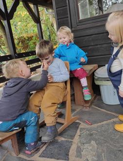 Die Waldmäuse spielten heute ausgiebig auf dem Grundstück. Es wurde gebaut, gebastelt, im Sand gespielt und sogar geschaukelt. Von alleine hatten sie den Einfall, herabgefallene Ahornblätter bunt anzumalen. Sie holten sich dicke Buntstifte und fingen gemeinsam an sie zu verzieren. Nachdem die Ahornblätter bemalt warenn kamen sie auf die Idee sich gegenseitig als wilde Tiere zu bemalen. Wir durften beobachten, wie liebevoll und sorgsam sie diese Idee umsetzten und alle Kinder große Freude dabei hatten.