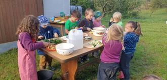 Zum Erntedankfest auf der Streuobstwiese in Groß-Bieberau kochten die Kinder nach der Apfelernte eine leckere Gemüsesuppe für ihre Familien. Vor dem gemeinsamen Mittagessen sahen wir das Puppenspiel vom „Birnenzwerg“.