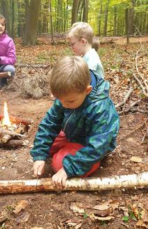 Die Aufgabe der Kinder war es, die Feuerstelle vorzubereiten, Holzspäne zu schnitzen und Kienspan (harzreiches Kiefern-, Tannen- oder Fichtenholz) zu suchen. Unter erwachsener Anleitung dürfen die Kinder das Feuer mit dem Feuerstein entzünden. Die Absprache lautet auch für zuhause genau so … “das Entzünden eines Lichtes, eines Feuers ist nur unter Anleitung und in Begleitung eines Erwachsenen erlaubt.“