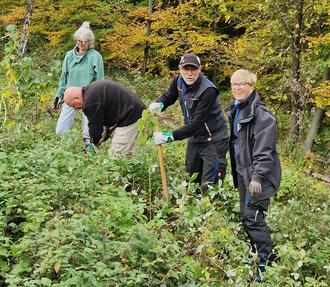 Insgesamt wurden 180 Bäume und 75 Sträucher gepflanzt. In die Erde gebracht wurden jeweils 45 Mehlbeeren, Elsbeeren, Speierlinge und Winterlinden, sowie jeweils 25 Schneeball-, Kreuzdorn-, und Weißdornpflanzen. Mit diesen Bäumen und Sträuchern wurde ein Waldrand gestaltet. Noch im November 2023 soll die restlich Fläche mit ca. 4500 Bäumen aufgeforstet werden. Nach getaner Arbeit war eine kleine Stärkung angesagt. Bei Apfelschorle, Punsch und Laugengebäck wurde zufrieden das bepflanzte Gebiet betrachtet. Jedes Pflänzchen wurde mit einem Wunsch für gutes Gedeihen bedacht und sicher wird der eine oder andere, der dort tätig war, übers Jahr nachschauen, wie es den Pflanzen geht.