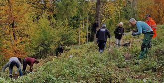 Ausgerüstet mit Spaten und Hacken trafen sich am Samstag, den 4.November 2023 rund 25 Männer, Frauen und Kinder am Eberhardts-Brünnchen. Die Umweltberatung und das Kulturamt der Gemeinde Brensbach hatten zu einer öffentlichen Pflanzaktion von Bäumen und Sträuchern im Hinterwald eingeladen. Unweit des Eberhardts-Brünnchens entstand durch Trockenheit, Windwurf und Borkenkäfer eine freie Fläche, die wieder aufgeforstet werden soll. Das Wetter spielte an diesem Morgen perfekt mit. Am Anfang ließ sich sogar die Sonne blicken und so konnten alle, nach Begrüßungsworten von Bürgermeister Rainer Müller, Ortsvorsteher Ewald Eifert und einer ausführlichen Einführung durch Revierförster Andreas Ott, mit dem Pflanzen beginnen.