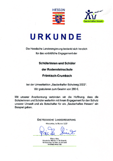 „Eure Schule gehört zu den Gewinnern der diesjährigen Aktion „Sauberhafter Schulweg“ der Umweltkampagne „Sauberhaftes Hessen“! Damit erhaltet ihr als Würdigung eures besonderen Engagements 200 €. Herzlichen Glückwunsch!
