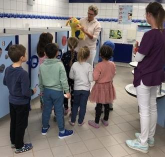 Diese Woche waren unsere Patenschaftszahnärztin Frau Dr. Jäger, Frau Rettig und Olli, der Zahnputzhund, bei uns in der Kita.