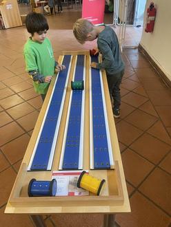 Die Kinder konnten beispielsweise vorgegebene Figuren mit Formen auslegen, Gegenstände ertasten, eine Brücke aus Teilen bauen, welche wie Leitern aussahen oder sich in eine Riesenseifenblase einschließen. „Mit Feiereifer“ waren alle dabei, Lösungen für die gestellten Aufgaben zu finden.