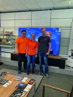 Einer von über 40 Unternehmensbesuchen des OREG-Wirtschafts-Service bzgl. „Garantiert geliefert“, führte Projektreferent René Karg (ganz rechts) auch nach Michelstadt zum Elektrofachmarkt expert Stommel. Geschäftsführer Christian Eigl (ganz links) und Gattin Vanessa Stommel (Mitte) freuen sich auf die zukünftige Zusammenarbeit im neuen Logistik-System. Sie werden mit ihrem Elektrofachmarkt in allen 3 Rollen (Warenversender, Ladeflächenanbieter und MikroHub-Betreiber) vertreten sein.