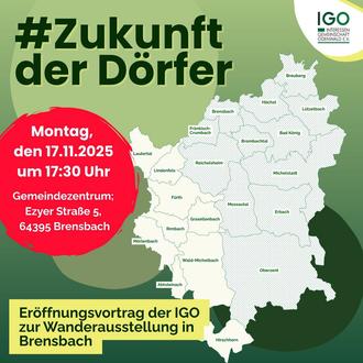sehr herzlich lade ich Sie zur Wanderausstellung „Zukunft der Dörfer“ am Montag, den 17. November 2025, um 17:30 Uhr in die Kulturhalle im Gemeindezentrum in Brensbach ein.