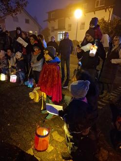 Am Feuerwehrhaus führten wir nochmals unser Martinsspiel vor, dann ging es mit unseren Laternen einmal quer durch den Ort.