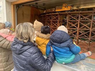Die Tageskinder von Ingeborg Stämmler und Elke Riebel bestaunen die Eisenbahnanlage von Rainer Amann in Wersau. Von dem geöffneten Ladenfenster aus konnten die Kleinen und ihre Betreuerinnen hautnah die große Lokomotive, Waggons und Tiere betrachten. Aufmerksam verfolgten gross und klein die Route des Zuges und die Geräusche der Dampflokomotive. Die leuchtenden Kinderaugen sind Ansporn, auch weiterhin bei Tools bei Kuhls vorbeizuschauen.