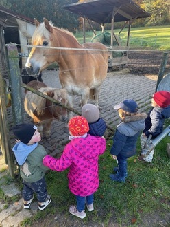 Bei der Familie Schüssler angekommen, wurden wir freundlich begrüßt. Die großen, sanften Pferde standen auf der Koppel und schauten uns interessiert entgegen. Für die kleinen Besucher war das ein großes Erlebnis! Mutig durften sie näher herantreten, streicheln und beobachten, wie die Pferde gemütlich ihr Futter knabberten. Einige Kinder entdeckten sogar, dass jedes Pferd seinen ganz eigenen Charakter hat – neugierig, verspielt oder eher ruhig.