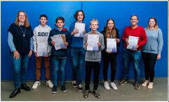 Das Bild zeigt von links: Laura Zieres (Schulleitung), Jonas Klinger, Silas Kohler, Pascal Göpfert, Noah Pfeifer, Kim Krichbaum sowie die Mathematiklehrkräfte Franziska Klein und Thomas Degenhardt. Fotocredit: Dr. Martin Schmidl.